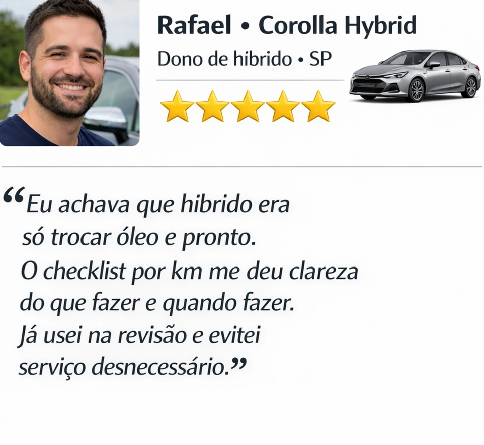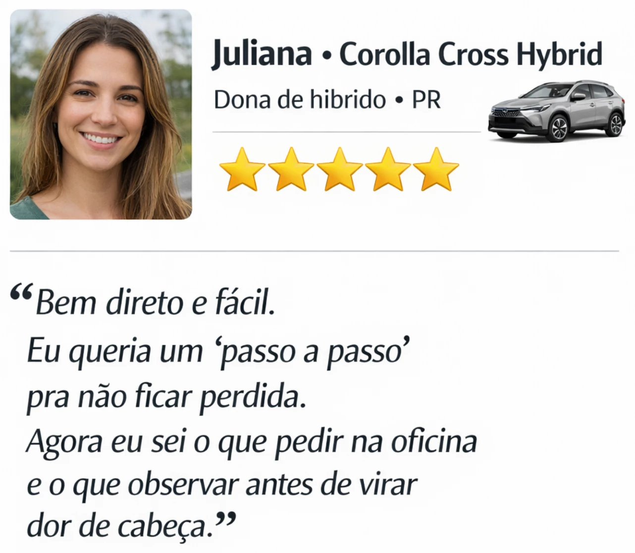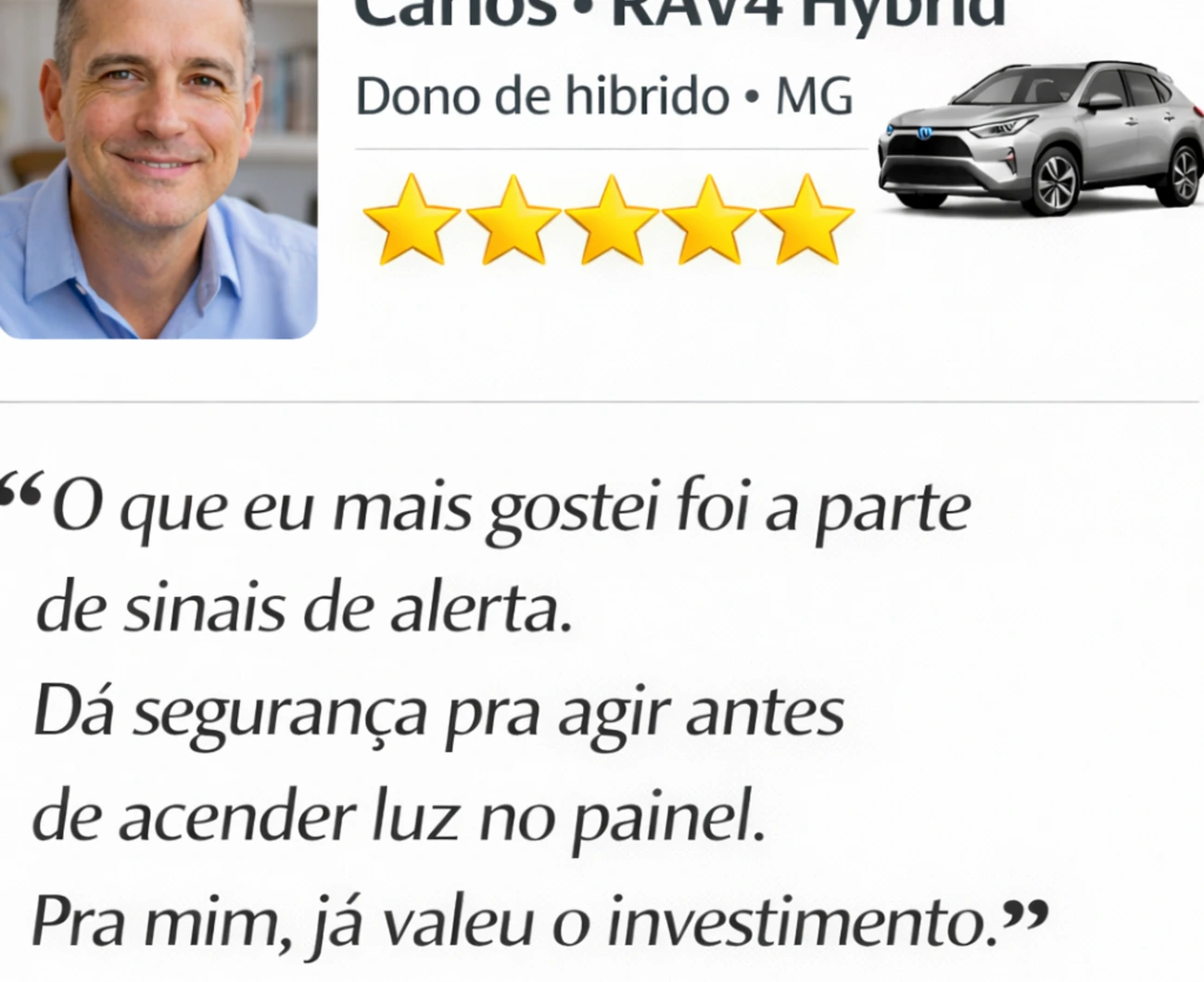 Ver print“Eu achava que híbrido era ‘só bateria’. O guia me deu clareza do que é prioridade e do que eu devo pedir na revisão. Ficou muito mais fácil acompanhar a manutenção.”
